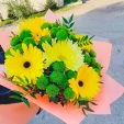 Попасть в объятия к солнцу и окружить любимую теплотой теперь еще проще! Достаточно заказать на сайте этот потрясающий по красоте букет, от которого веет положительными эмоциями. Роскошные желтые садовые герберы и миниатюрные головки зеленых хризантем составляют достойный дуэт красок. Букет понравится жизнерадостным девушкам и женщинам, он привнесет в их жизнь частичку праздника, жаркого лета и мирного солнца.
