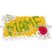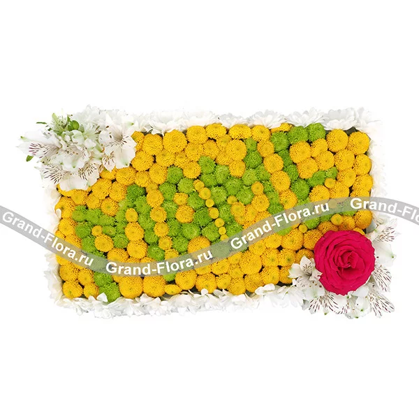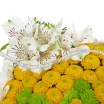 Стандартный: хризантема кустовая желтая (сантини) - 15 шт., хризантема кустовая зеленая - 5 шт., хризантема кустовая белая - 7 шт., альстромерия белая - 2 шт., роза розовая - 1 шт., оазис.