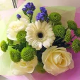 роза белая - 3 шт, гербера белая - 1 шт, хризантема кустовая зеленая - 2 шт, статица - 1 шт,  фетр из двух слоев - зеленый и фиолетовый, лента. Примерный размер: 20Х20 см.
