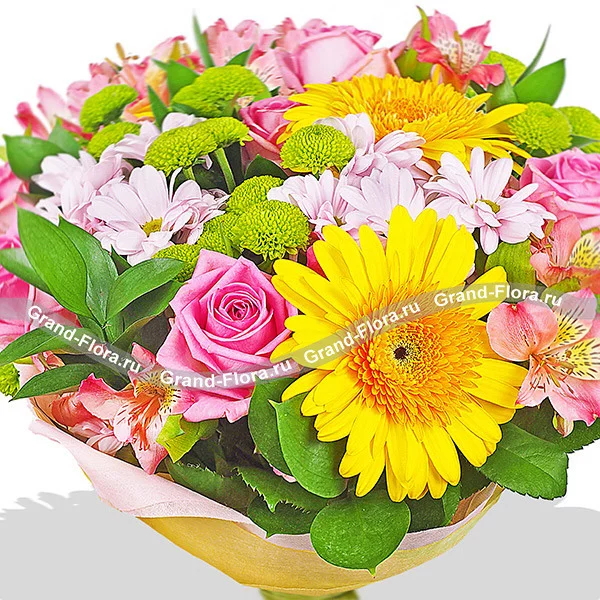 ДЕЛЮКС: роза розовая - 15 шт, гербера желтая - 6 шт, альстромерия розовая - 6 шт, хризантема кустовая зеленая - 5 шт, хризантема кустовая светлая - 4 шт, рускус, фетр желтый. Примерный размер: 45Х45 см.