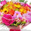 Хризантема ромашковая фиолетовая - 9 шт., гербера оранжевая - 5 шт., гербера желтая - 4 шт., роза розовая - 6 шт., роза оранжевая - 5 шт., альстромерия оранжевая - 6 шт., альстромерия розовая - 6 шт., хризантема одноголовая зеленая - 6 шт., лист рабелини - 5 шт., натуральная упаковка розовая, бант в тон.