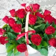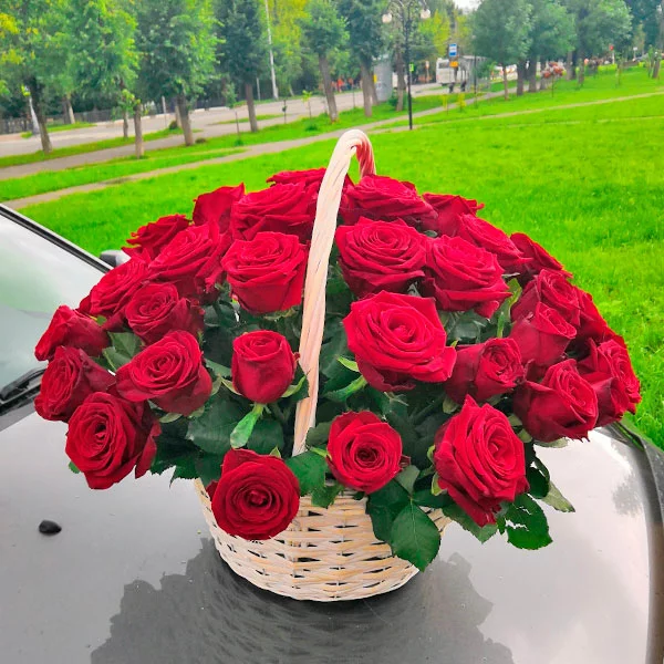 Выбрали 51 розу. Заказали доставку по случаю юбилея нашего руководителя и очень рады что выбрали именно эту компанию! Все соответствует фото на сайте: светлая корзина и отменные, крупные красные розы.