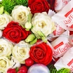 Стандартный: роза красная - 3 шт., роза кустовая белая - 3 шт., гиперикум - 1 шт., ель, конфеты Raffaello, елочная игрушка – 1 шт., оазис, коробка.