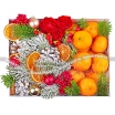 кустовые розы - 5шт., ель., гиперикум - 2 шт., шишки - 5 шт., елочные шарики - 8 шт., новогодний декор., мандарины - 1,5 кг., коробка.