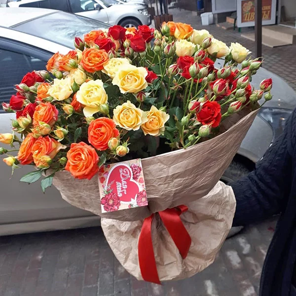 Уже который год пользуюсь Вашими услугами в разных городах и еще ни разу не не подвели меня. За что отдельное спасибо. Кустовая роза это любимые цветы моей дочери, поэтому долго не раздумывая мой выбор пал именно на такой букет. Роза свежайшая, на следующий день бутоны стали раскрываться, минимум упаковки (как я и просила). В общем дочь счастлива и мне радостно, что смогла с Вашей помощью передать ей свои поздравления, находясь далеко от нее. Благодарю.