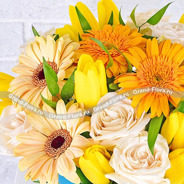 Стандартный (на фото): гербера оранжевая - 3 шт., гербера желтая - 3 шт., роза белая - 6 шт., тюльпан желтый - 11 шт., декоративная зелень, оазис, коробка. Примерный размер: 25Х30 см.