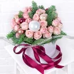 Стандартный(на фото): роза кустовая розовая - 7 шт., новогодние игрушки - 8 шт., ель, оазис, коробка.