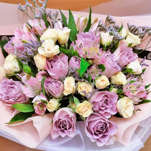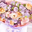 Чарующие и необыкновенные розы сиреневого и кремового  оттенка, розовая эустома и фиолетовый лимониум в букете выглядят гармонично, роскошно и привлекательно.